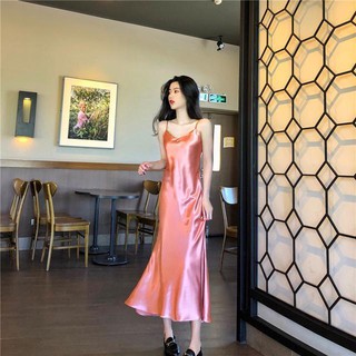 Chilala Sa Tag Araw Ng Maaari Kang Magsuot Ng Satin Na Pantulog Na Pambabae Pantal Ng Pambabae Dalisay Na Kulay Na Sutla Na Nadulas Sa Tuhod Na Mahabang Palda Damit Sa Bahay