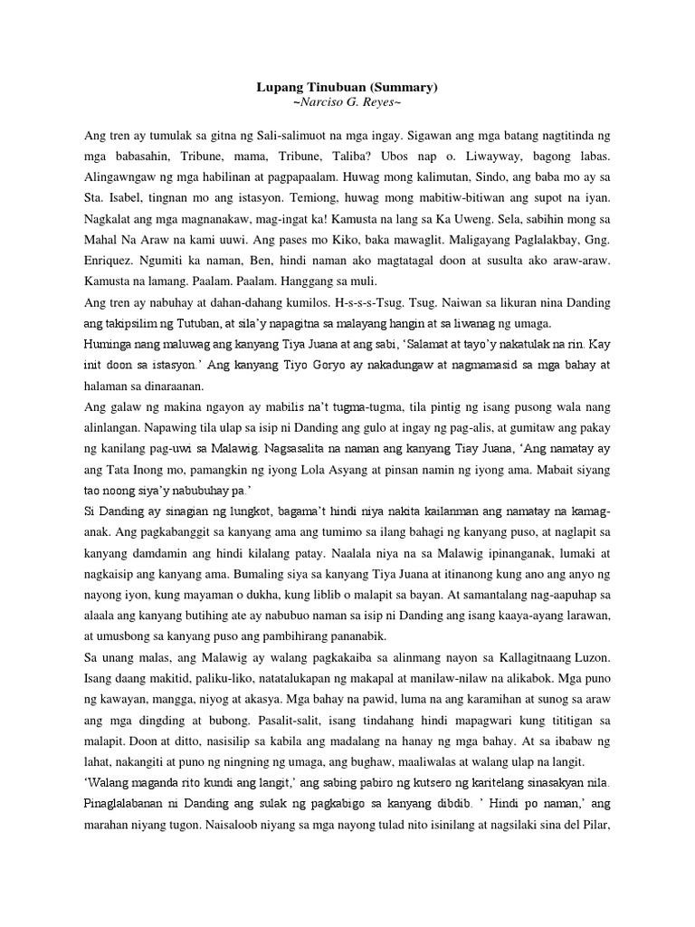 Wala naman silang nadaraanang puno na may bunga para makapitas. Wala nang mhihiling pa si Pinang sa pag aarugang ibinibigay ng kanyang ina na si aling Ros a. Buod po ba yan ng lupang tinubuan kasi po rereport po kasi ako sa filipino subject ei sabi po buod lng daw po yung kunin ko sa kwento.