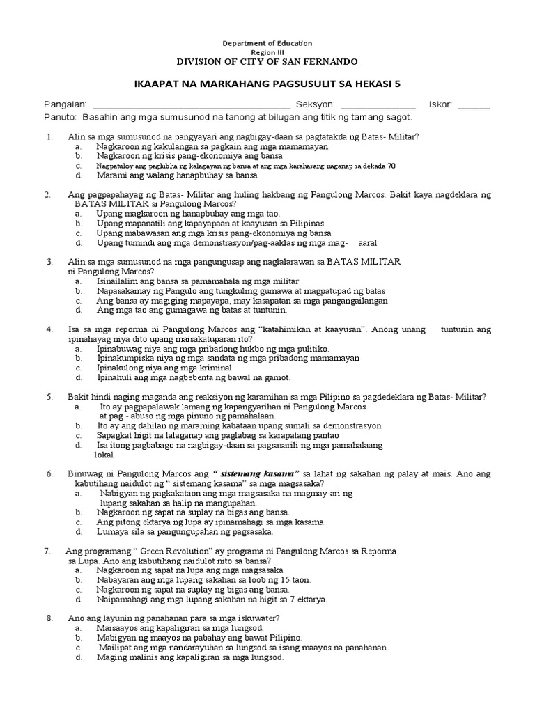 Kalagayan ng Pilipinas sa Pamumuno ni Pangulong Marcos Idineklara ang Batas Militar noong ika-21 ng Setyembre taong 1972 sa bisa ng Proklamasyon Blg. Alin sa mga sumusunod ang dahilan ng pag-usbong ng manoryalismo. 1 question Ang kultura ng malling sa pilipinas.